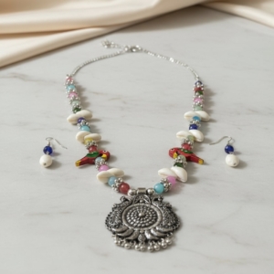 Playful and vibrant, this oxidized necklace set brings together traditional artistry with a fun bohemian twist. Featuring a bold circular oxidized pendant detailed with intricate floral motifs, the design is balanced with colorful beads, natural shell accents, and charming parrot figurines for a unique handcrafted appeal.