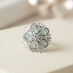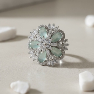 Radiating charm and elegance, the Celestia Mint Blossom Statement Ring is a floral-inspired masterpiece. Featuring soft mint-green pear-cut stones arranged like delicate petals, the design blooms with brilliance. Each petal is framed with shimmering cubic zirconia, complemented by baguette-cut accents that add a starburst sparkle to the overall look.