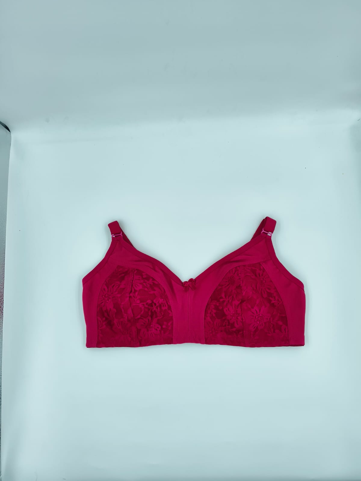 This bra features full-coverage, non-padded cups with elegant floral lace detailing that adds a feminine touch while keeping the look smooth under most outfits.