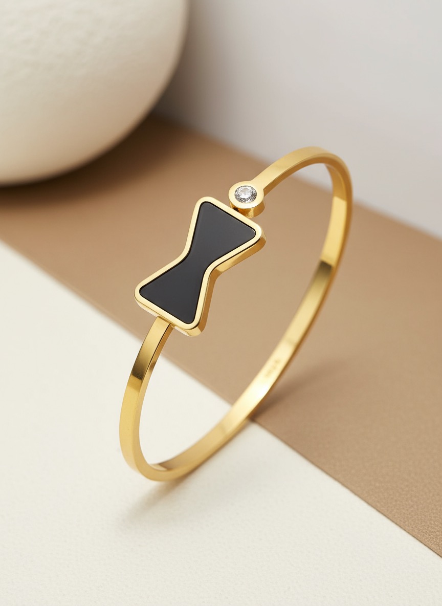 A timeless statement of elegance, the Eterna Noir Hourglass Bangle features a sleek black enamel hourglass motif framed in radiant 18k gold plating. A single brilliant-cut crystal accent adds a touch of sparkle, symbolizing the beauty of time and balance. Designed with a modern minimalist silhouette, this bangle is perfect for elevating both everyday wear and evening attire.