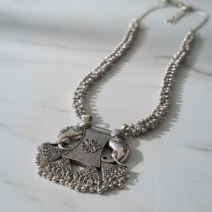 The necklace features a beautifully detailed dual-elephant pendant, adorned with floral engravings and delicate metallic beadwork that exudes ethnic charm. The chain is crafted with intricately linked oxidized silver beads, offering both durability and elegance. Matching earrings complete the set, showcasing a perfect blend of artistry and heritage.