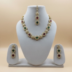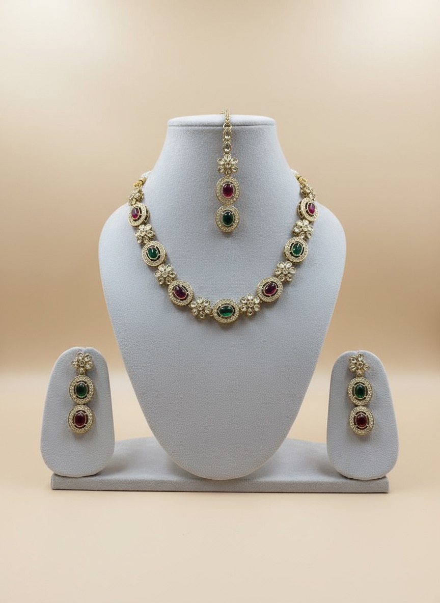 The striking dual-tone gemstone contrast enhances its regal aura, making it a perfect adornment for weddings, festive occasions, or any celebration that calls for a statement of luxury. Paired with matching earrings and a maang tikka, this set brings harmony, grace, and opulence together in one stunning ensemble.
