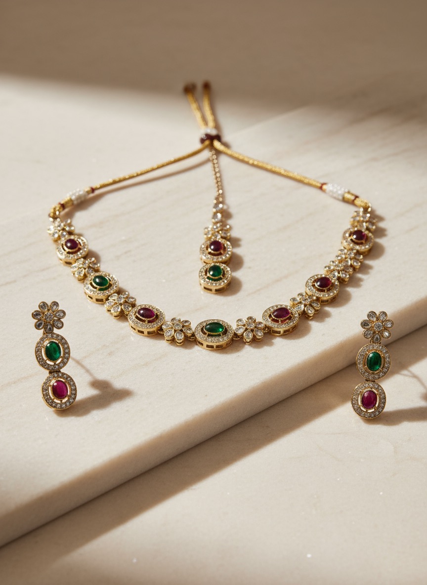 Be the first to review “Regal Ruby & Emerald Blossom Necklace Set”