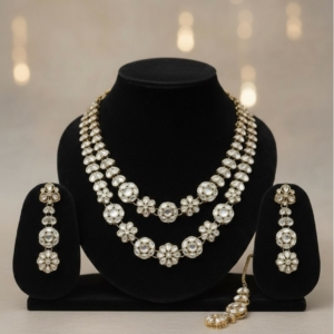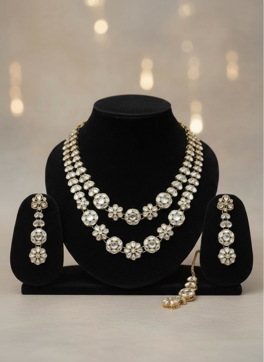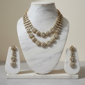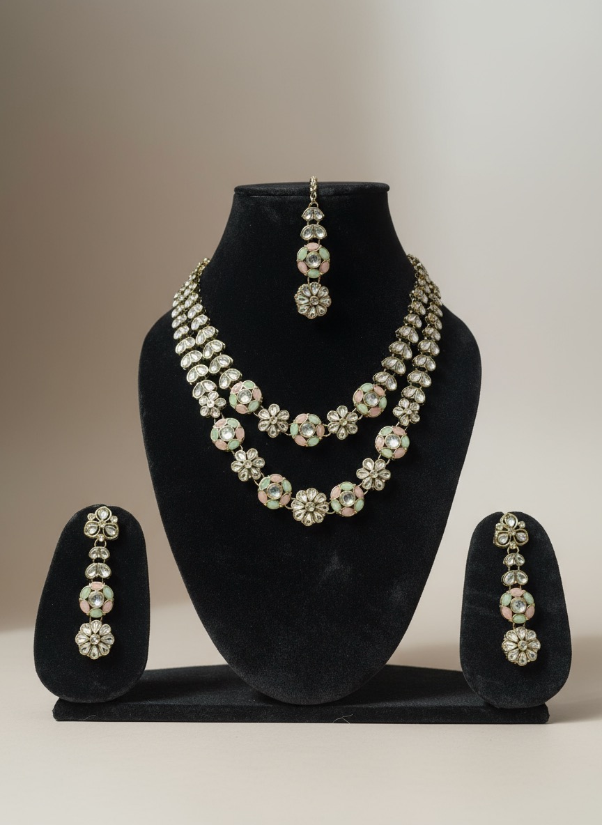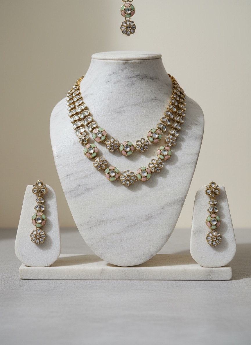 Celebrate tradition with grace in the Royal Blossom Kundan Necklace Set. This exquisite jewelry piece showcases dual layers of shimmering kundan stones, accented with pastel pink and mint enamel floral motifs. Each petal is carefully crafted, creating a harmonious blend of heritage and elegance.