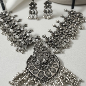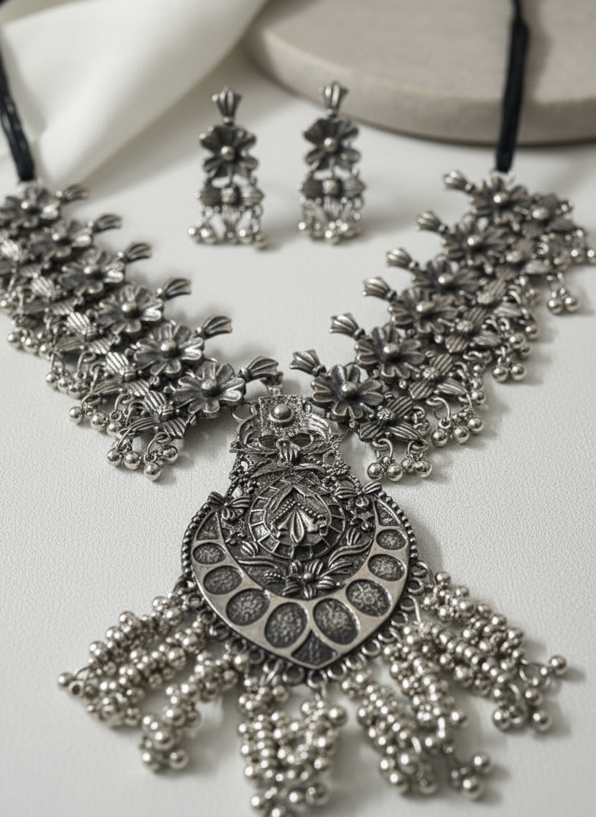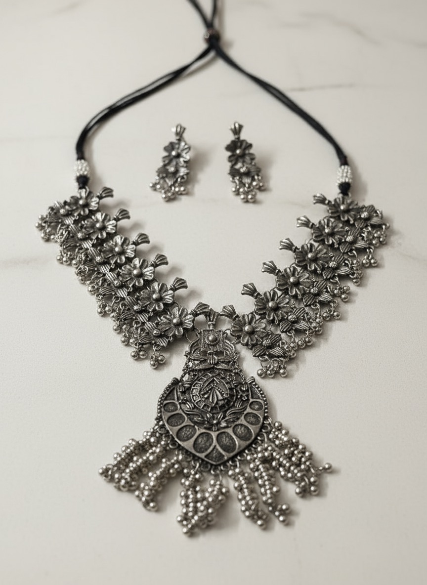 A true expression of heritage and artistry, this oxidized silver necklace set showcases intricate floral detailing paired with a bold central pendant. Designed with clusters of handcrafted flowers along the neckline and finished with a traditional motif pendant adorned with cascading silver beads, this piece celebrates timeless ethnic charm.